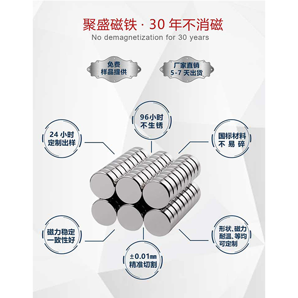 定制强力磁铁找厂家,小编推荐了,东莞厂家聚盛磁铁,生产经验丰富,原材料充足,定制款都可在15天内出货,设厂长达10年有余,生产设备精良,打造出质感美观的磁铁。所生产的种类以及尺寸高达上千款,是非常具有经验的生产厂家。
